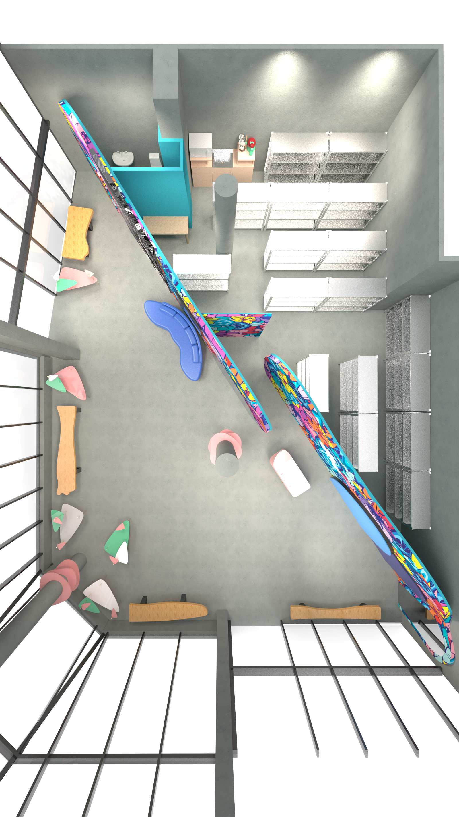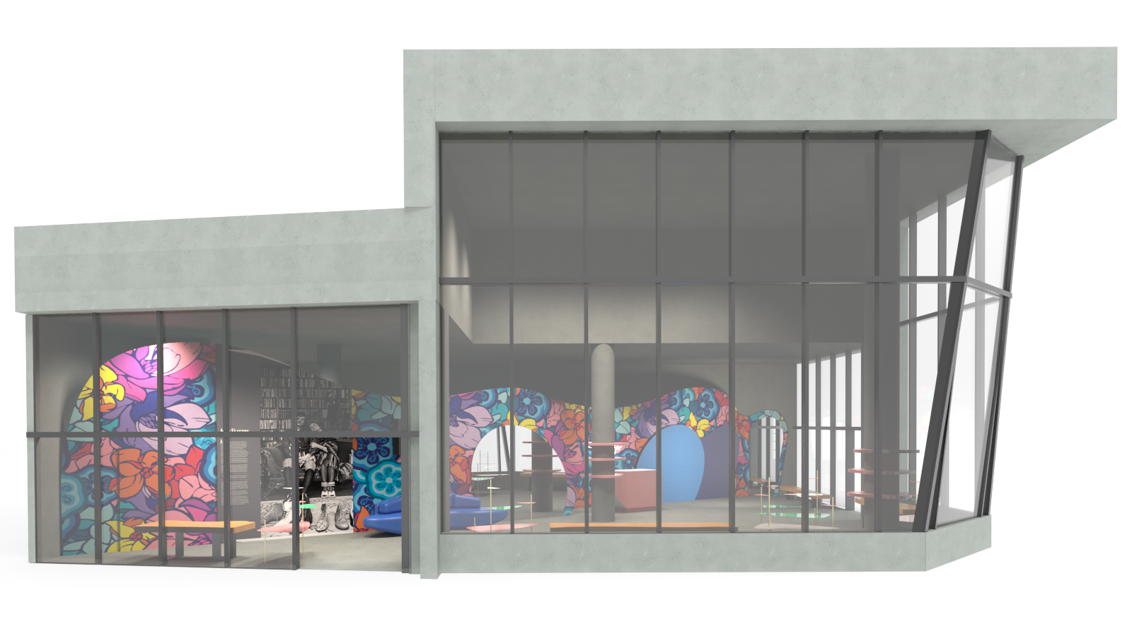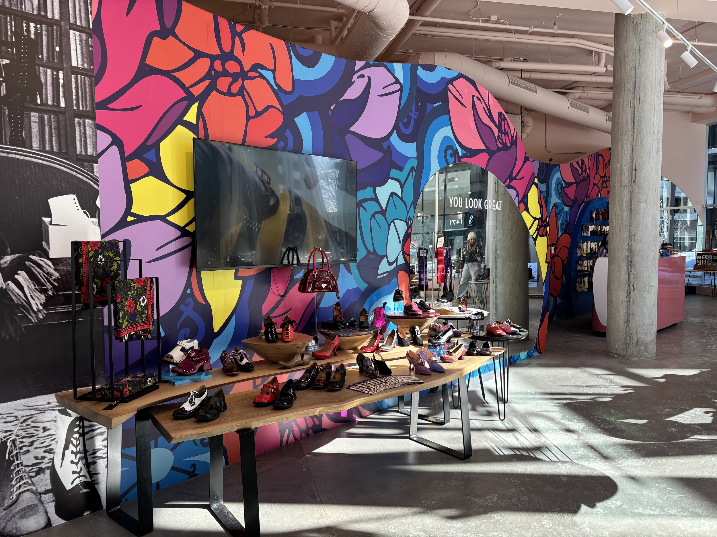 Starting from a completely empty shell, the goal was to create a highly functional space while staying true to the brand’s whimsical identity. We explored multiple floor plans and layout options, pushing each version further, until landing on the boldest solution, one that also made the best use of the space.From there, we developed the final floor plan, along with detailed shop drawings and 3D models/renders to clearly communicate the design intent. Also created fabrication and installation drawings for the wallpaper, custom accessory walls, and mirrors.The final result feels like a true extension of the Fluevog identity, while introducing a more immersive and unexpected way to experience the space.